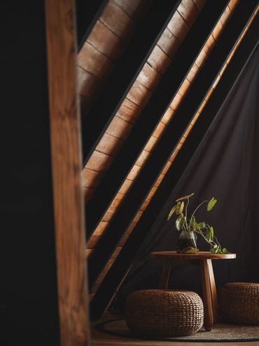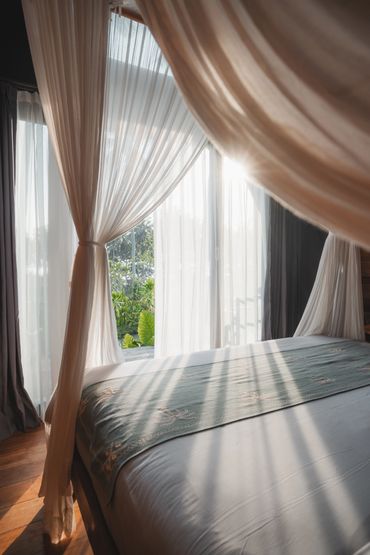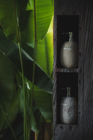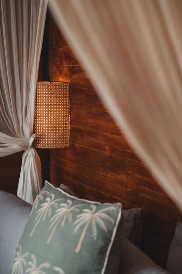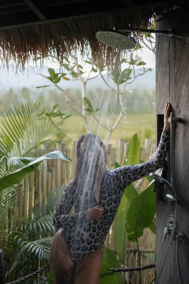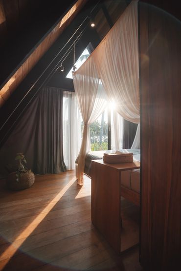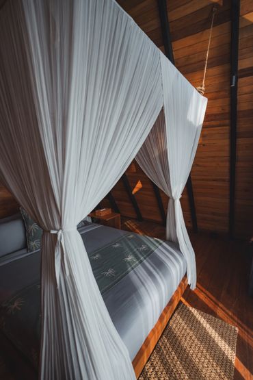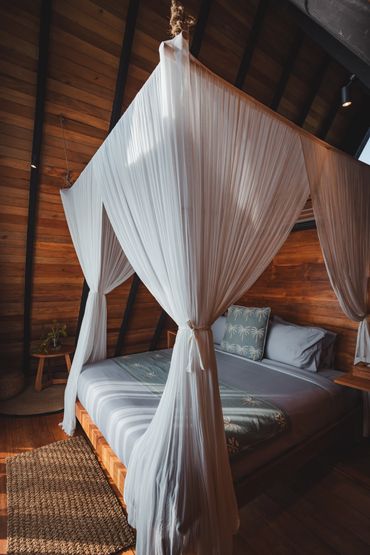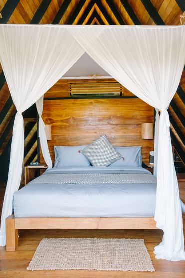 Your stylish A-frame timber cabin has sweeping ocean, rice field and mountain views. Enjoy barefoot luxury with air conditioning, a king size bed, mosquito net, high quality mattress and bedding, kitchenette, open air ensuite bathroom, hair dryer, organic toiletries, yoga mats, a private deck with seating, a room safe & fast wifi.